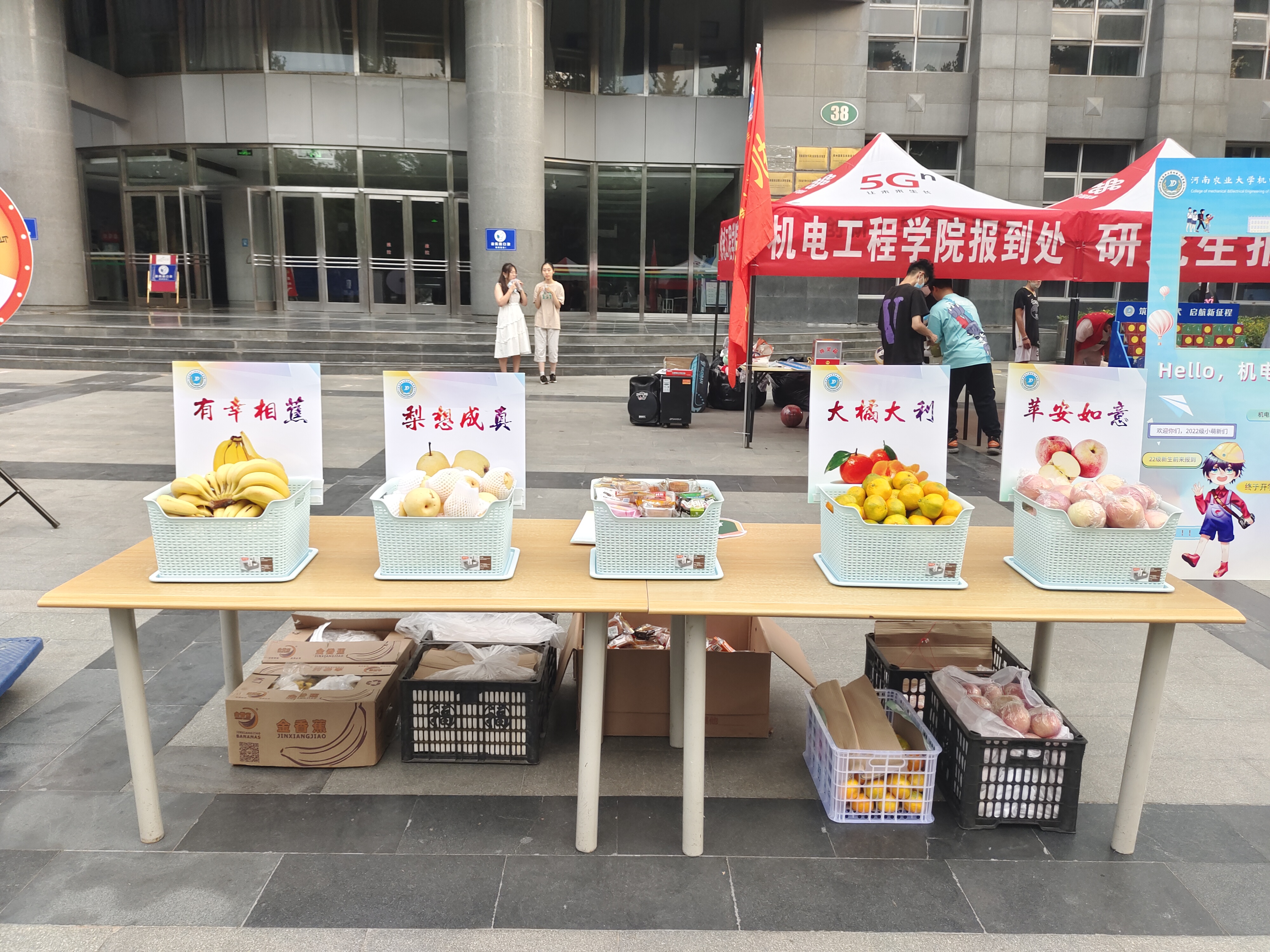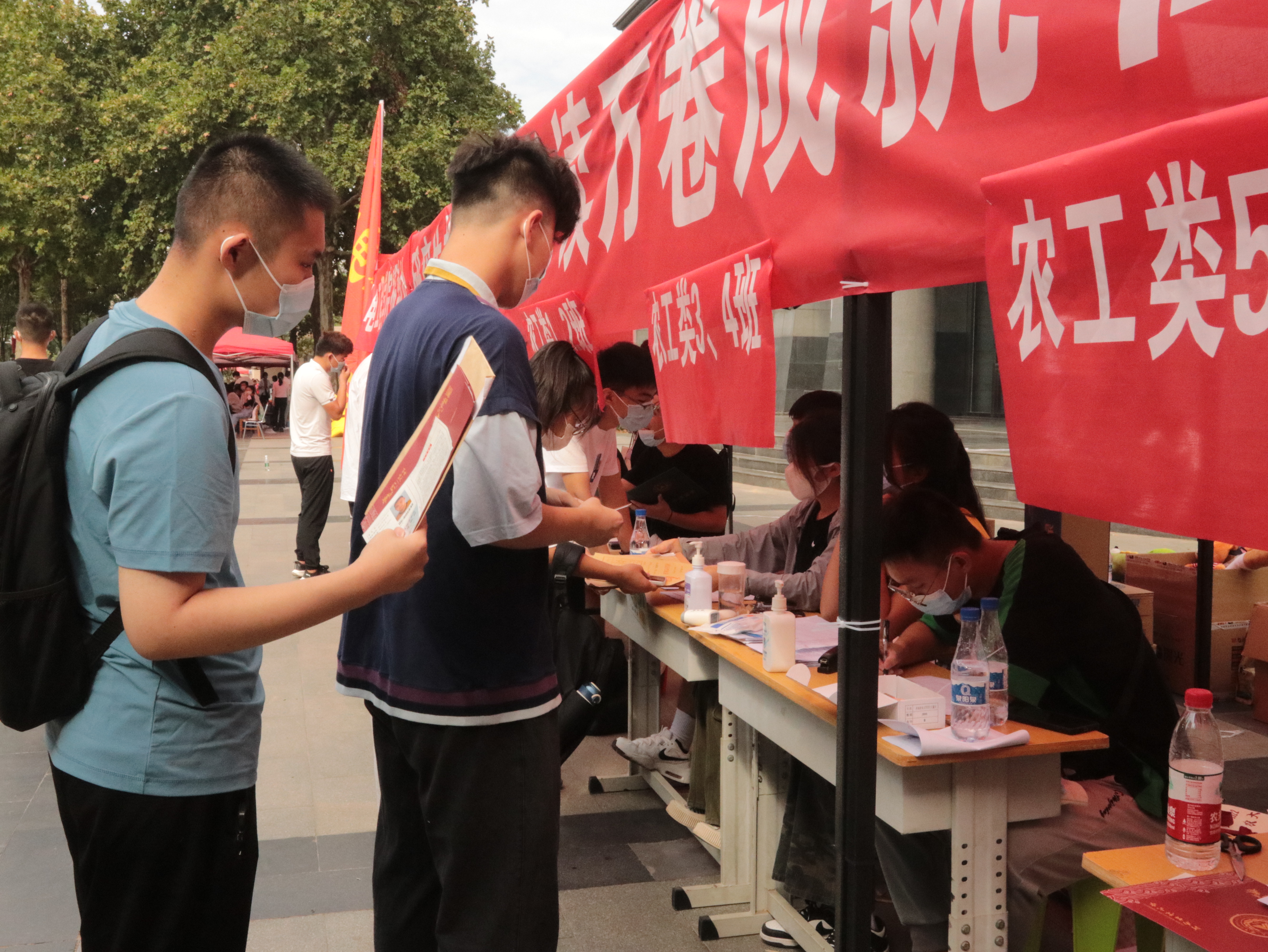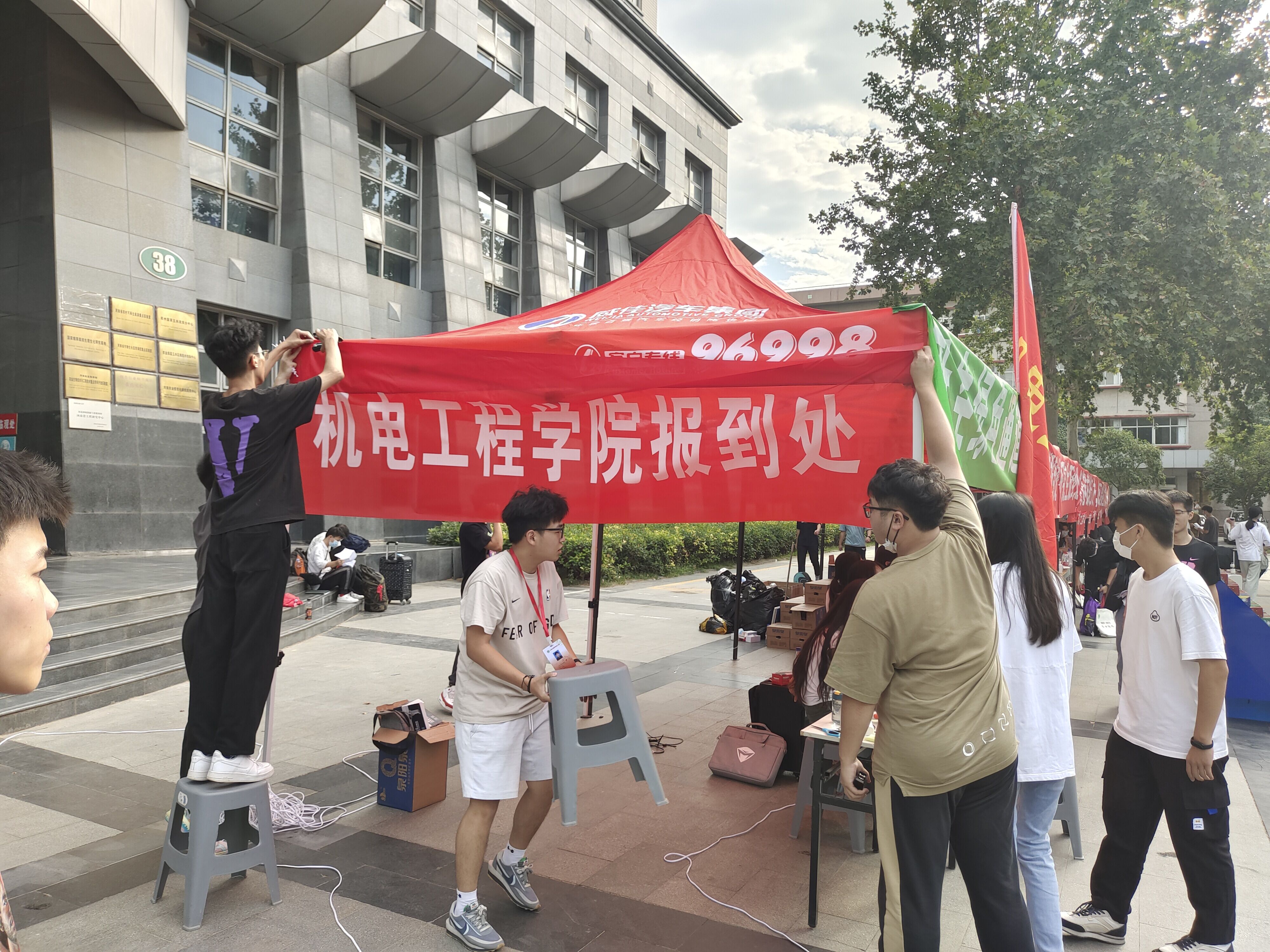 学生工作人员和学生志愿者提前抵达报到地点分工就位,在他们的努力之下,整理资料档案、摆放桌椅板凳、张贴班级横幅等各项准备工作有条不紊地进行着。