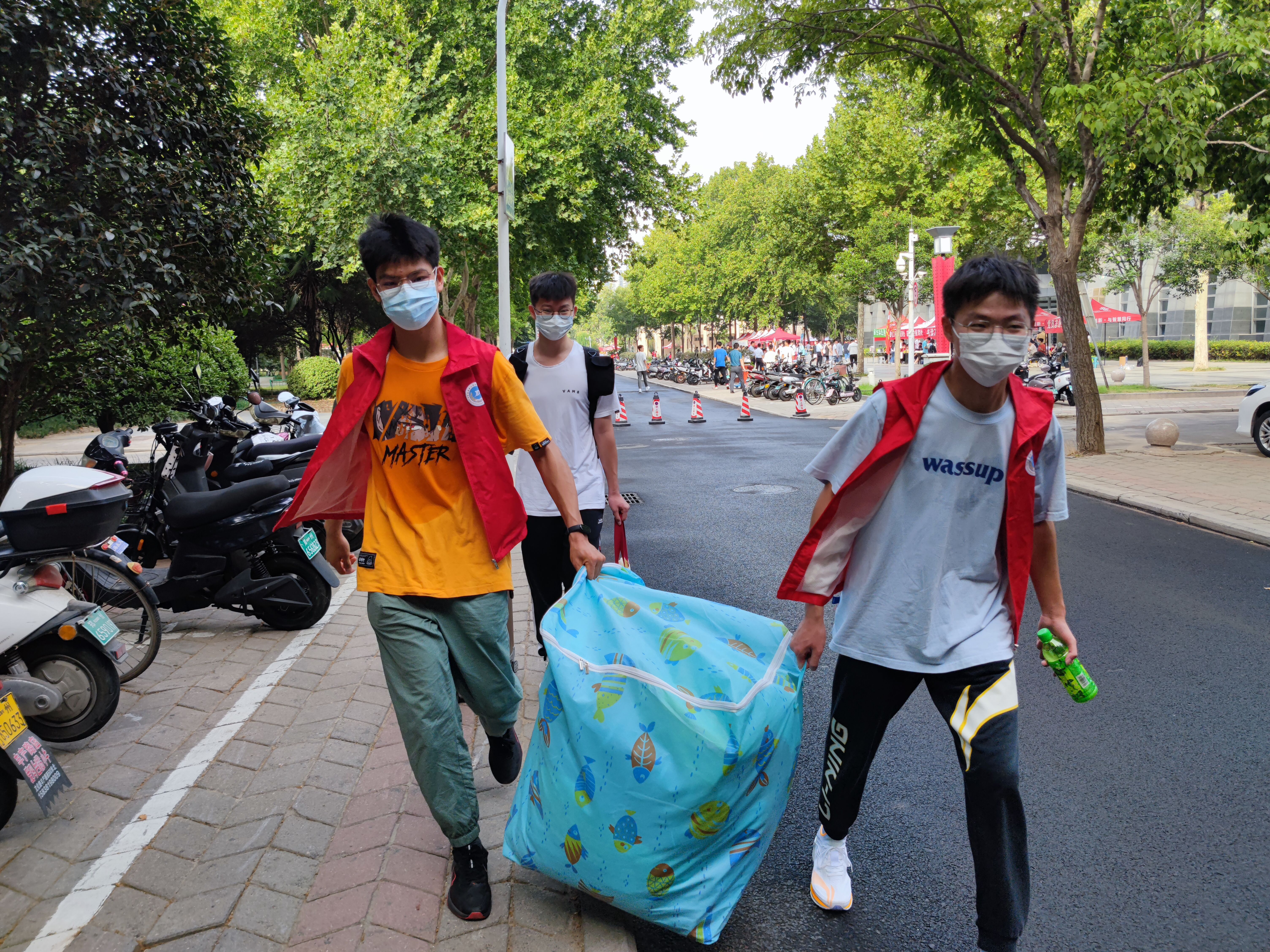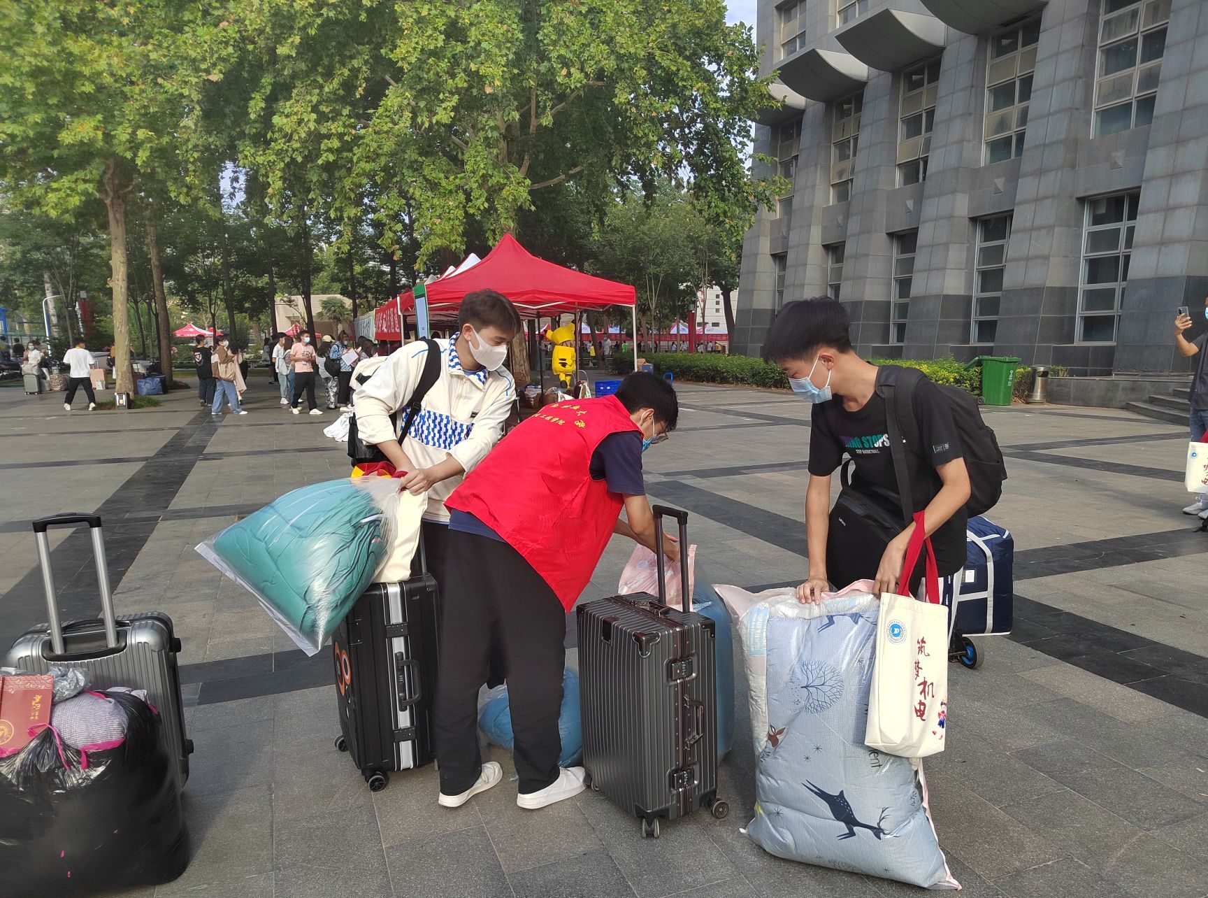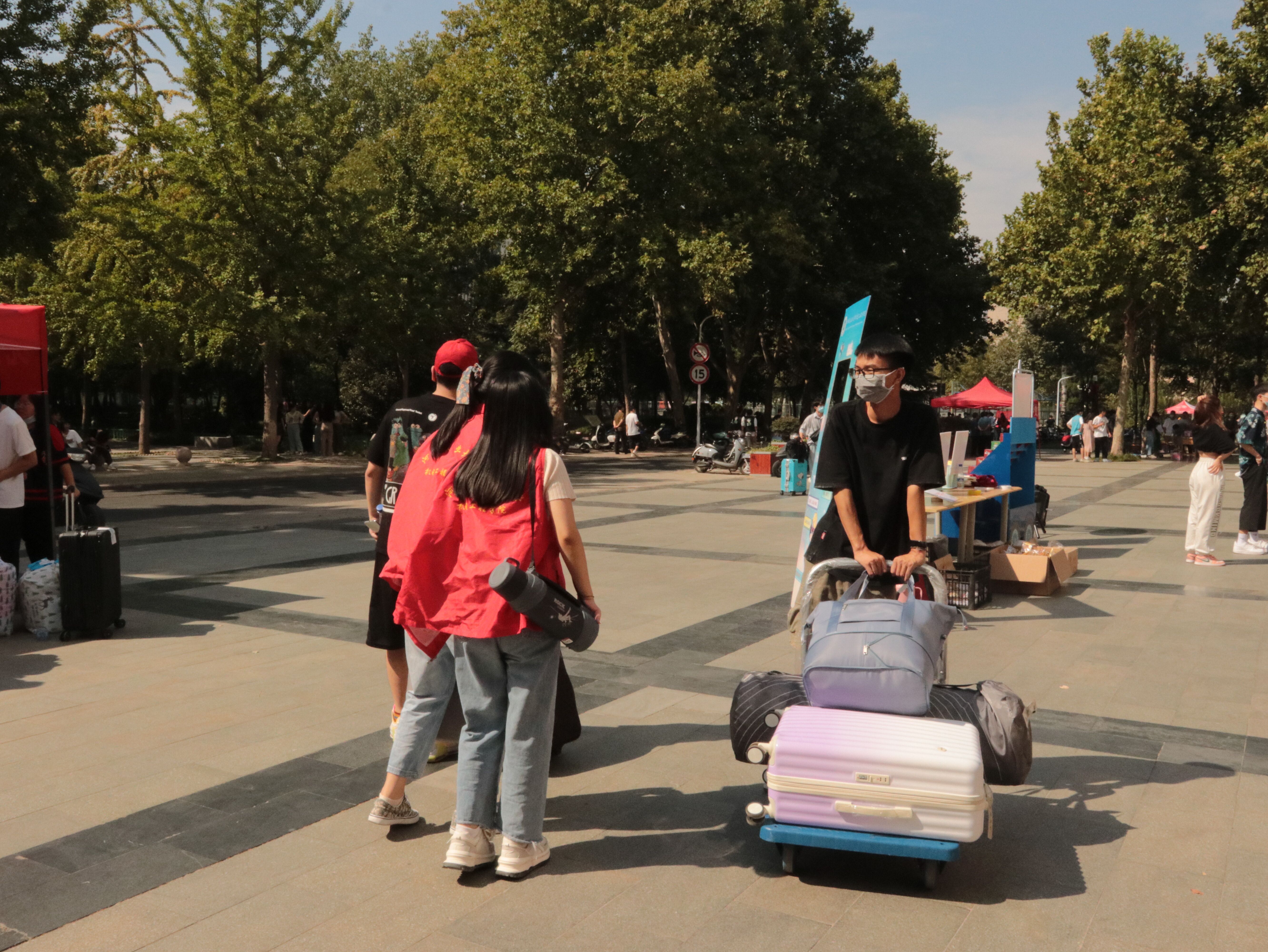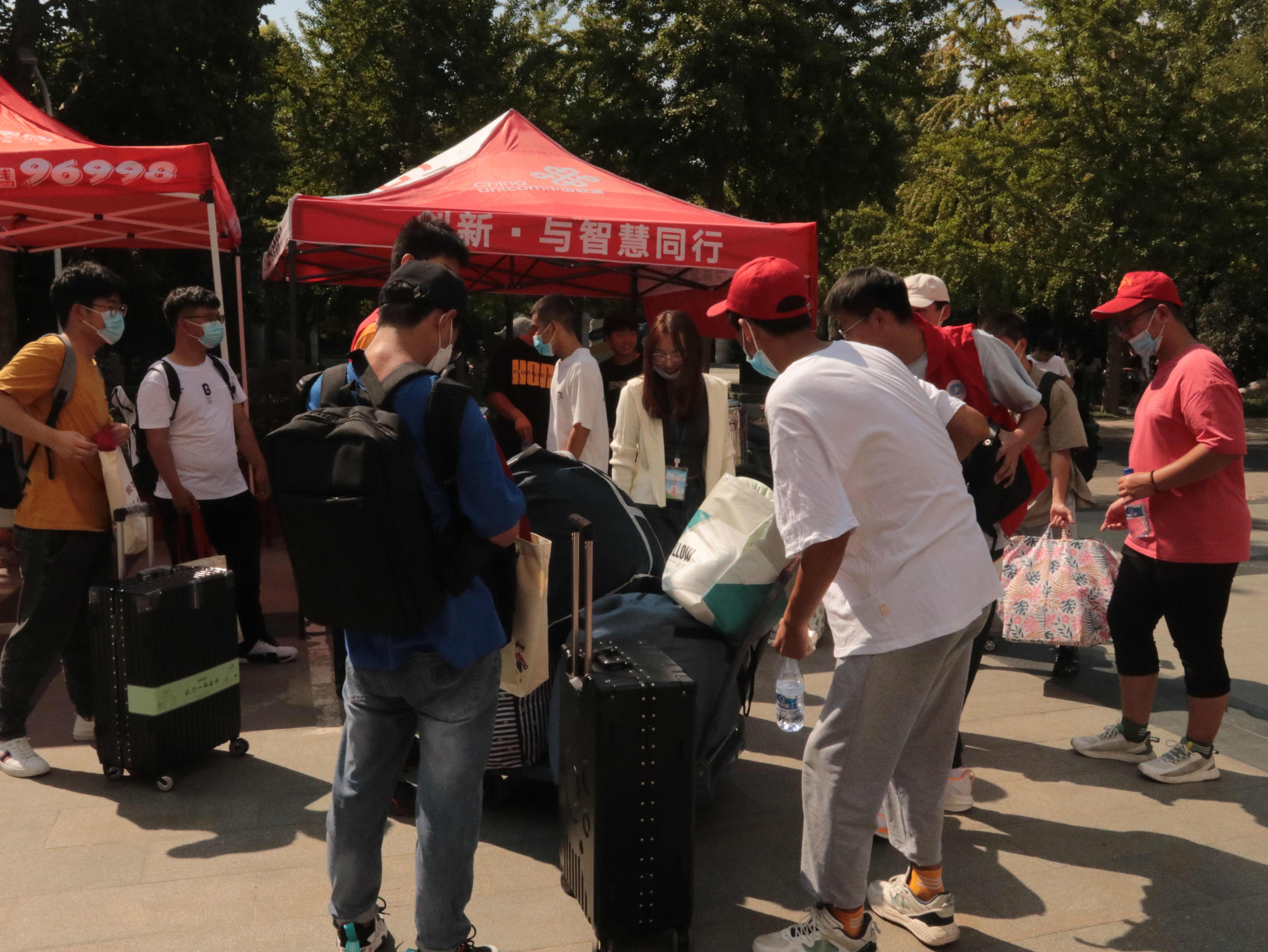 迎新现场,清晰的学院标识、显眼的红色帐篷、暖心的横幅标语为新生搭建起了入学报到的第一站。伴随着新生的陆续到来,学生工作人员耐心引导新生逐步完成入校报到工作,从检查报到所需材料到提醒新生参加核酸检测,为新生在各个环节里保驾护航、指引方向,确保学生顺利报到;学生志愿者积极提供热心服务,深入迎新志愿服务一线,热情帮助新生将行李搬运至所在宿舍,使得新生报到更加便捷和高效。