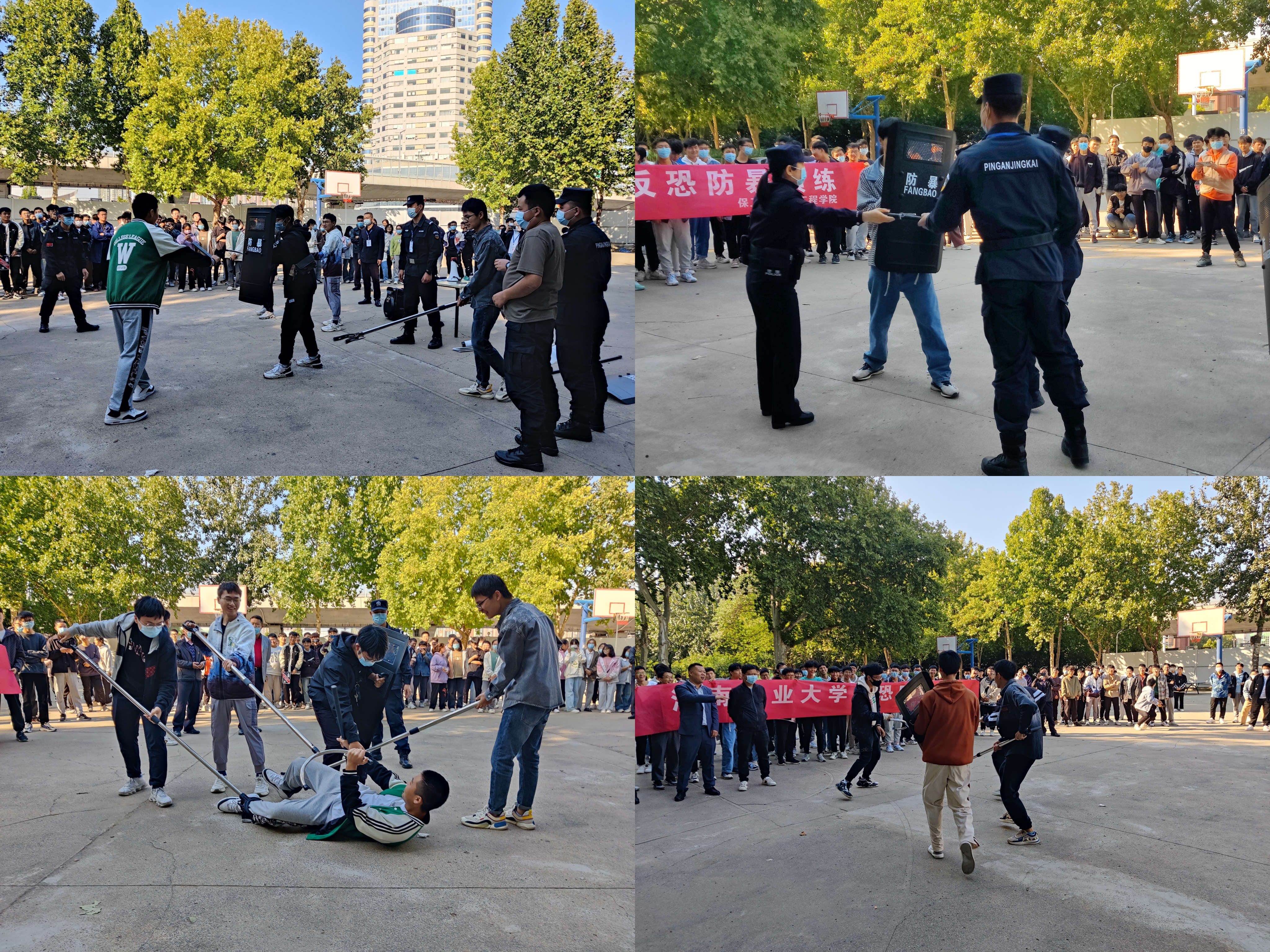 演练现场,一名持械“歹徒”校园行凶。保卫处马上组织安保人员赶到现场,手持钢叉、盾牌、棍棒将“歹徒”围住,与“歹徒”交涉、周旋,随后双方展开激烈搏斗,特勤人员用脚锁锁住“歹徒”,联手制伏“歹徒”,避免师生受到伤害。整个演习过程分为一名歹徒持械入校行凶,安保人员和师生代表分组进行多场景应急处置实战演习。演练现场组织有序、氛围热烈,师生参与热情高,活动受到师生一致好评。