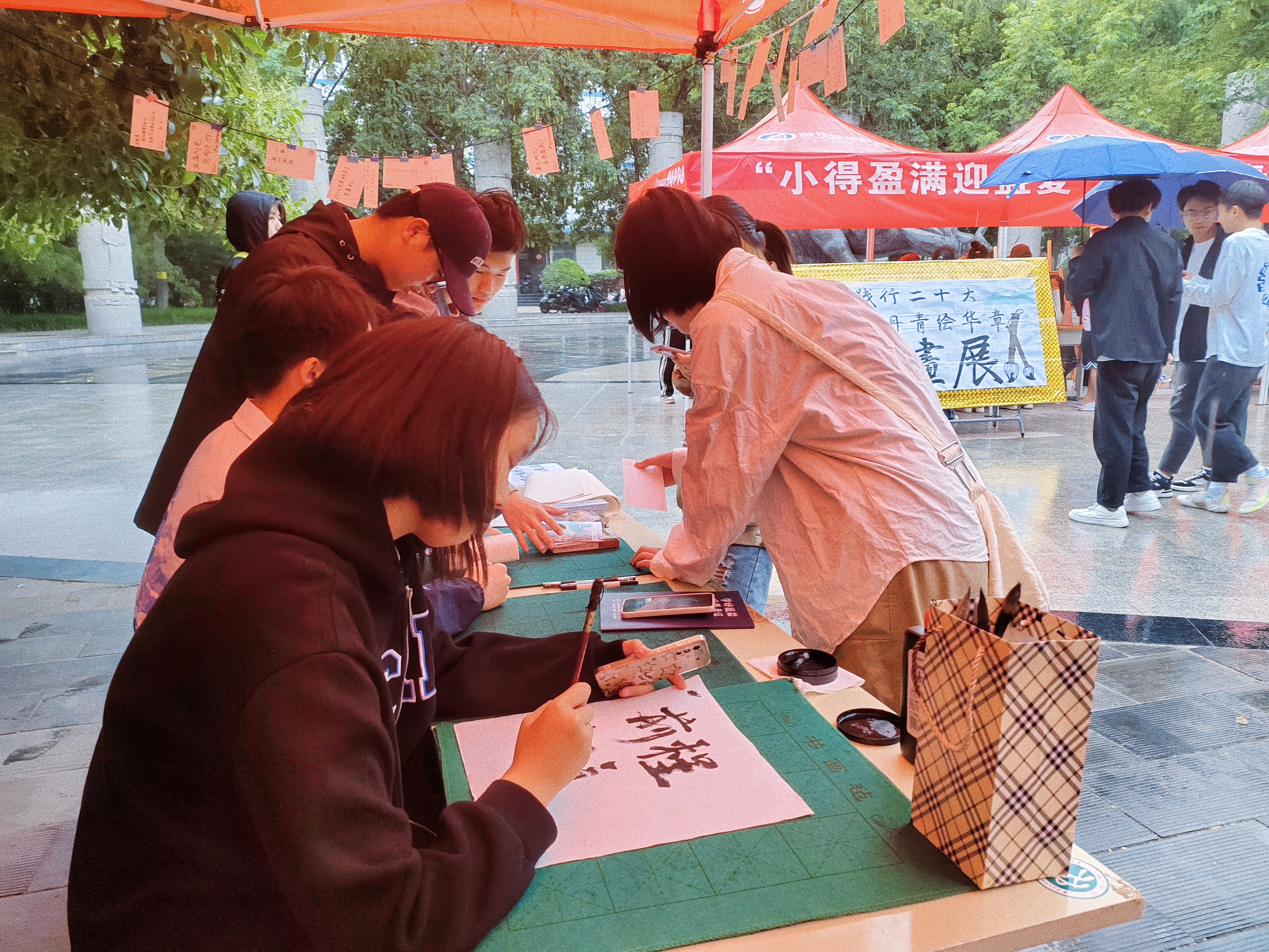 伴随着歌曲,活动拉开序幕。一幅幅生动传神、色彩明丽,极富感染力的作品吸引了大批学生前来参观,他们在书画作品前驻足观赏,细心品味,互相交流观赏书画之感,并积极参加现场的书写祝福活动,同时也参与现场组织的投票活动,全场呈现出一片欢乐和谐的氛围。