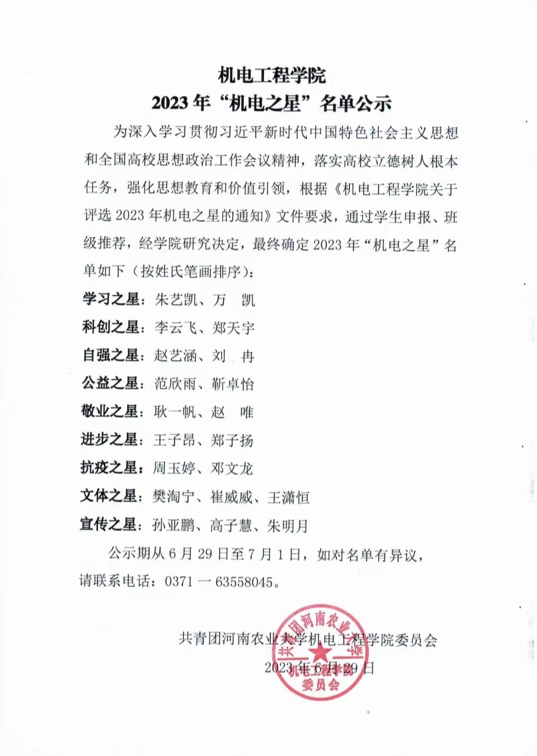 为深入学习贯彻习近平新时代中国特色社会主义思想和全国高校思想政治工作会议精神,落实高校立德树人根本任务,强化思想教育和价值引领,根据《色情小说网 关于评选2023年机电之星的通知》文件要求,通过学生申报、班级推荐,经学院研究决定,最终确定2023年“机电之星”名单如下(按姓氏笔画排序):