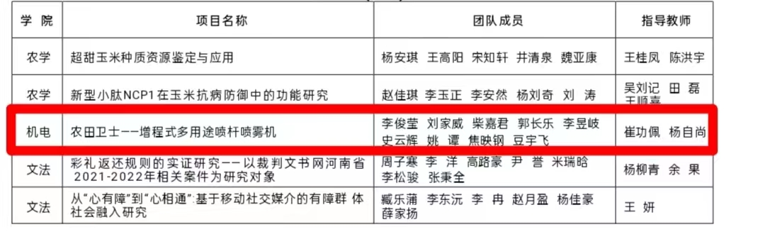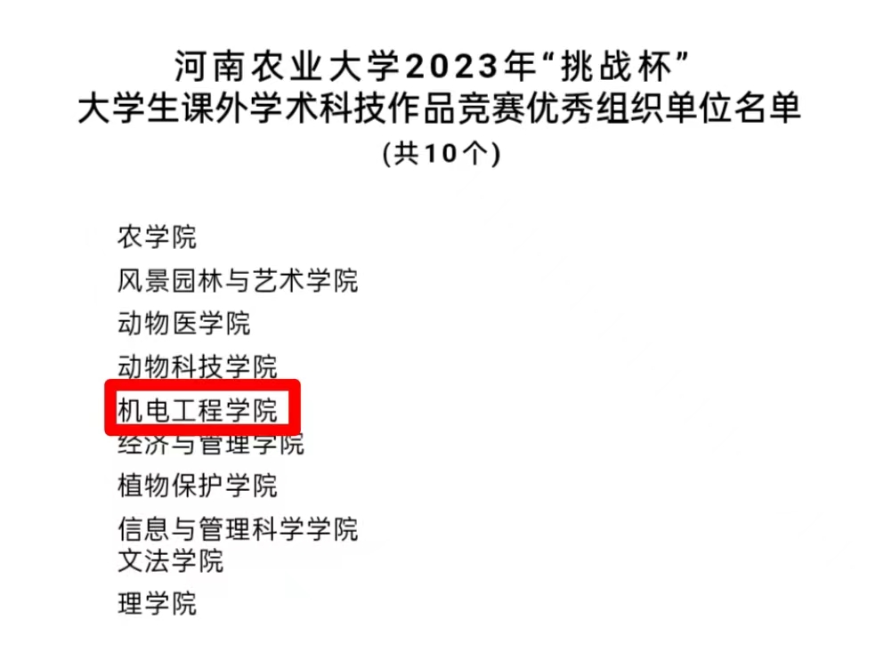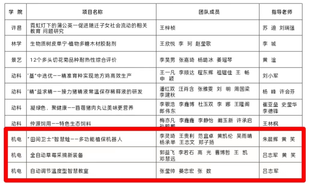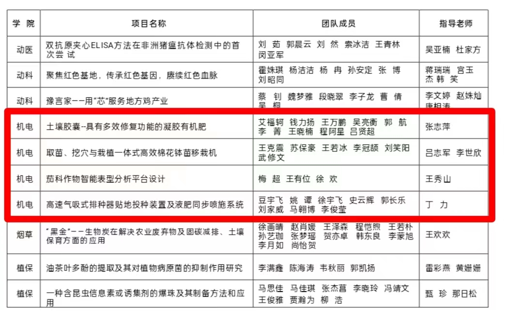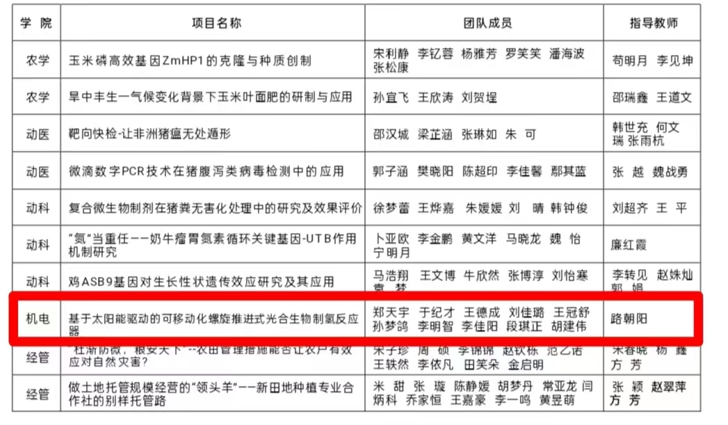 参赛作品《农田卫士——增程式多用途喷杆喷雾机》获评特等奖;作品《基于太阳能驱动的可移动化螺旋推进式光合生物制氢反应器》获评一等奖;《取苗、挖穴与栽植一体式高效棉花钵苗移栽机》等三项作品获评二等奖;《“田间卫士”智慧蛙——多功能植保机器人》等七项作品获评三等奖。