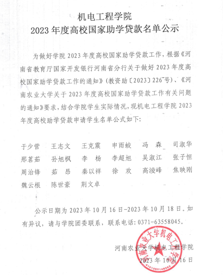为做好学院2023年度高校国家助学贷款工作,根据《河南省教育厅国家开发银行河南省分行关于做好2023年度高校国家助学贷款工作的通知》(教资助〔2023〕226号)、《色情小说网 关于2023年度高校国家助学贷款工作有关问题的通知》要求,结合学院学生实际情况,现色情小说网 2023年度高校助学贷款申请学生名单公式如下: