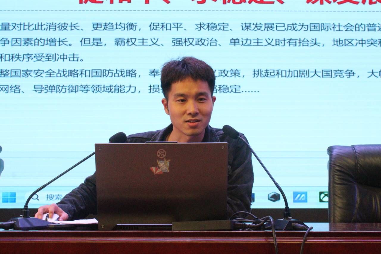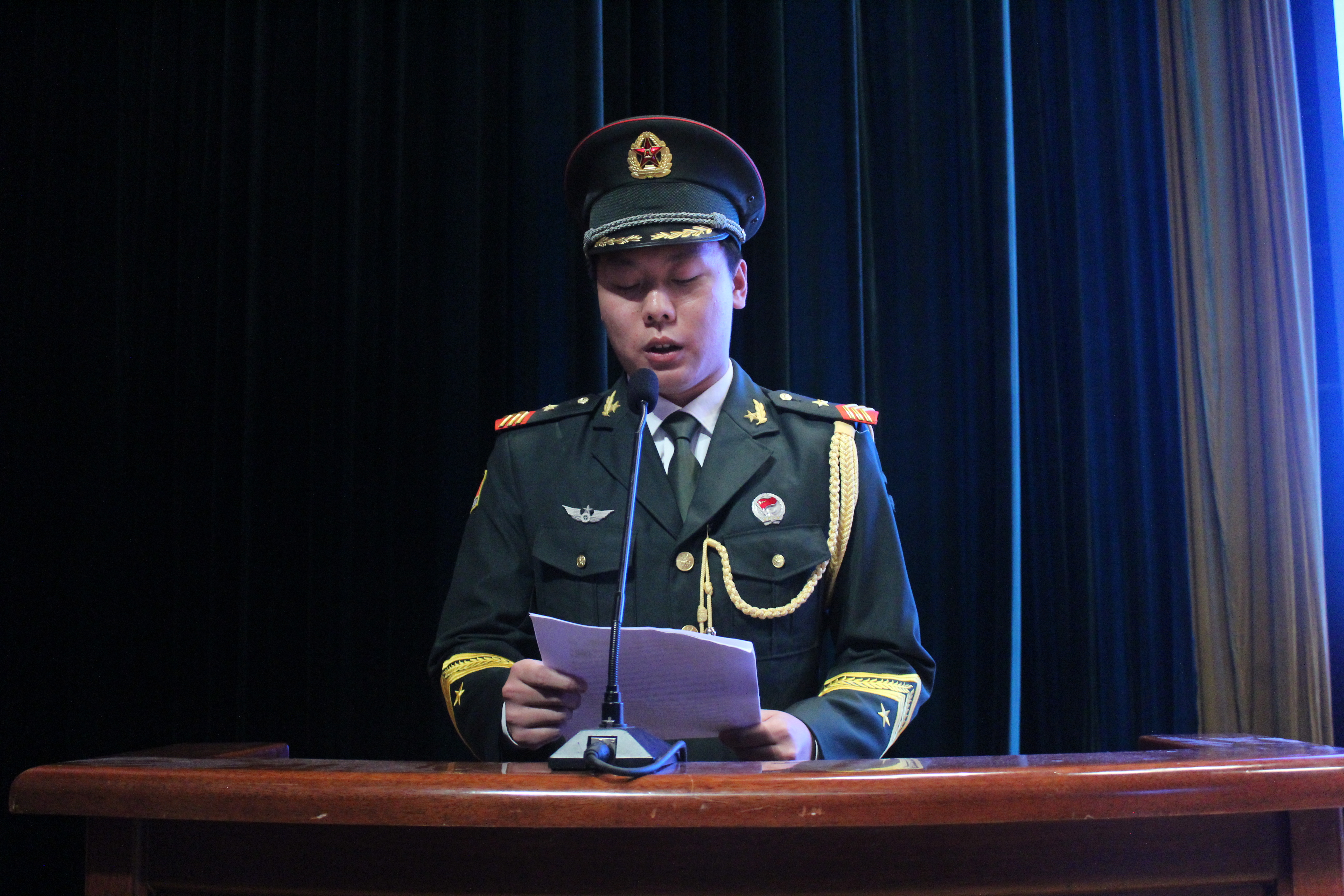 农大铁军成员田雪磊作为代表发言,他用自己的实际经历向大家传达了军人的自豪感,同时建议学生们关注国家所处的国际形势,全力以赴、报国无悔,用自己的一腔热血担当起新时代青年大学生的名号。