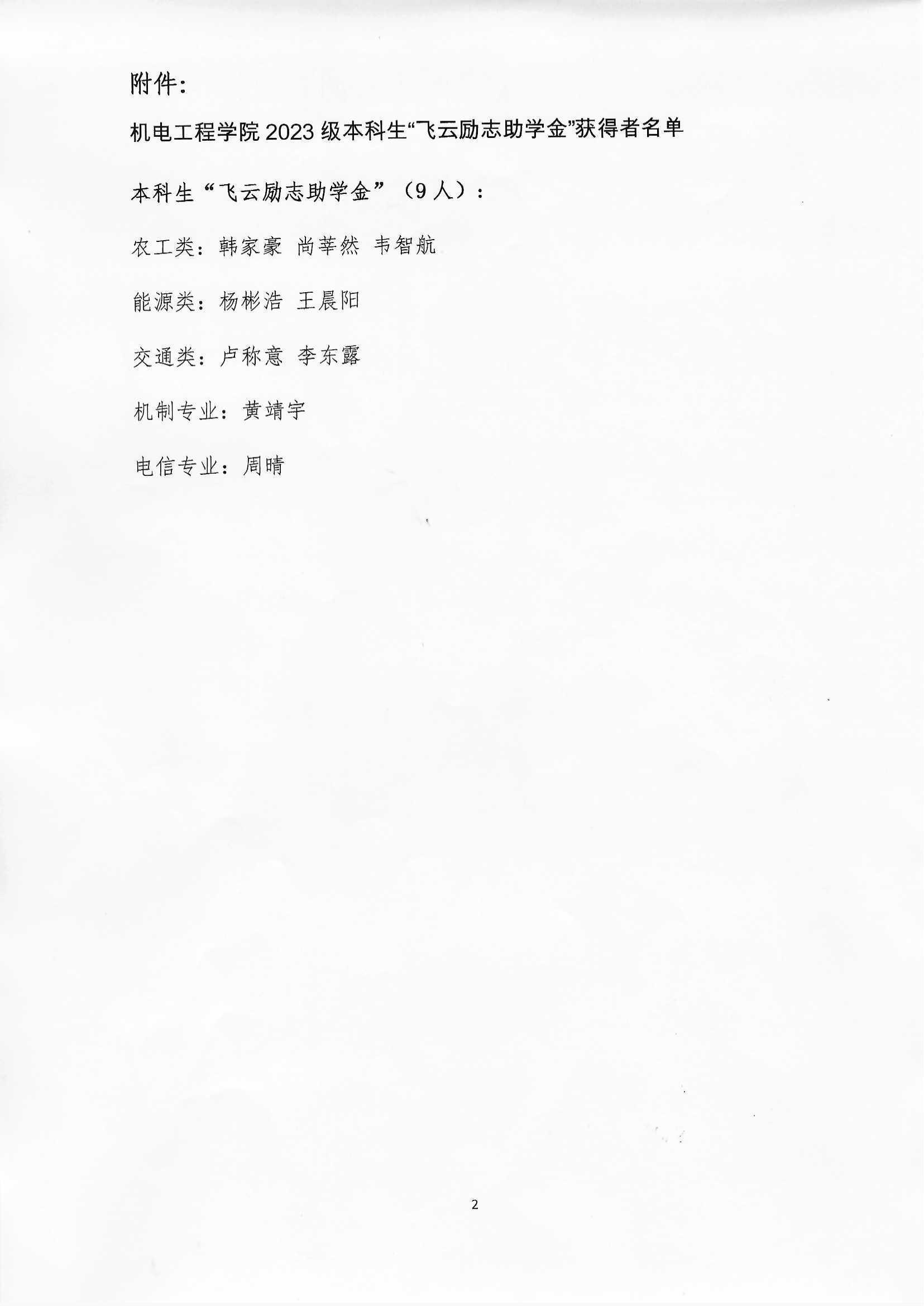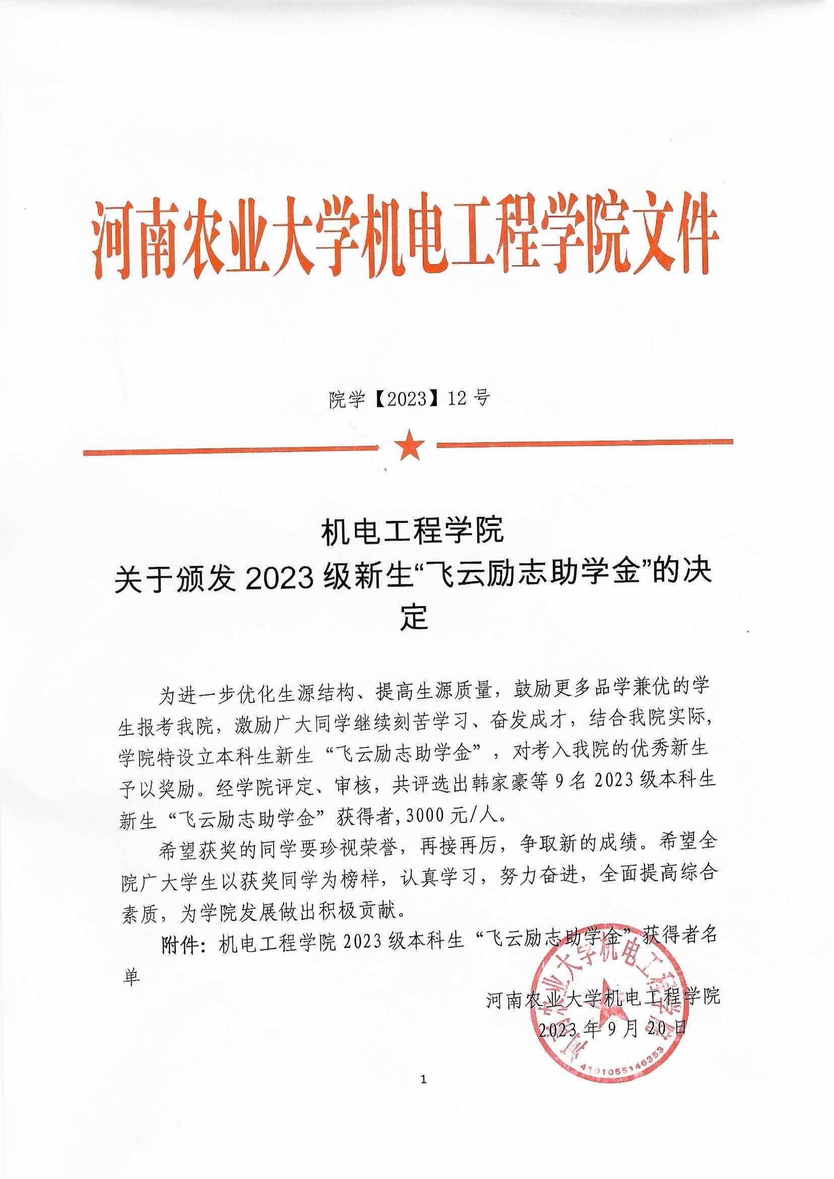 的优秀新生予以奖励。经学院评定、审核,共评选出韩家豪等9名2023级本科生新生“飞云励志助学金”获得者,3000元/人。