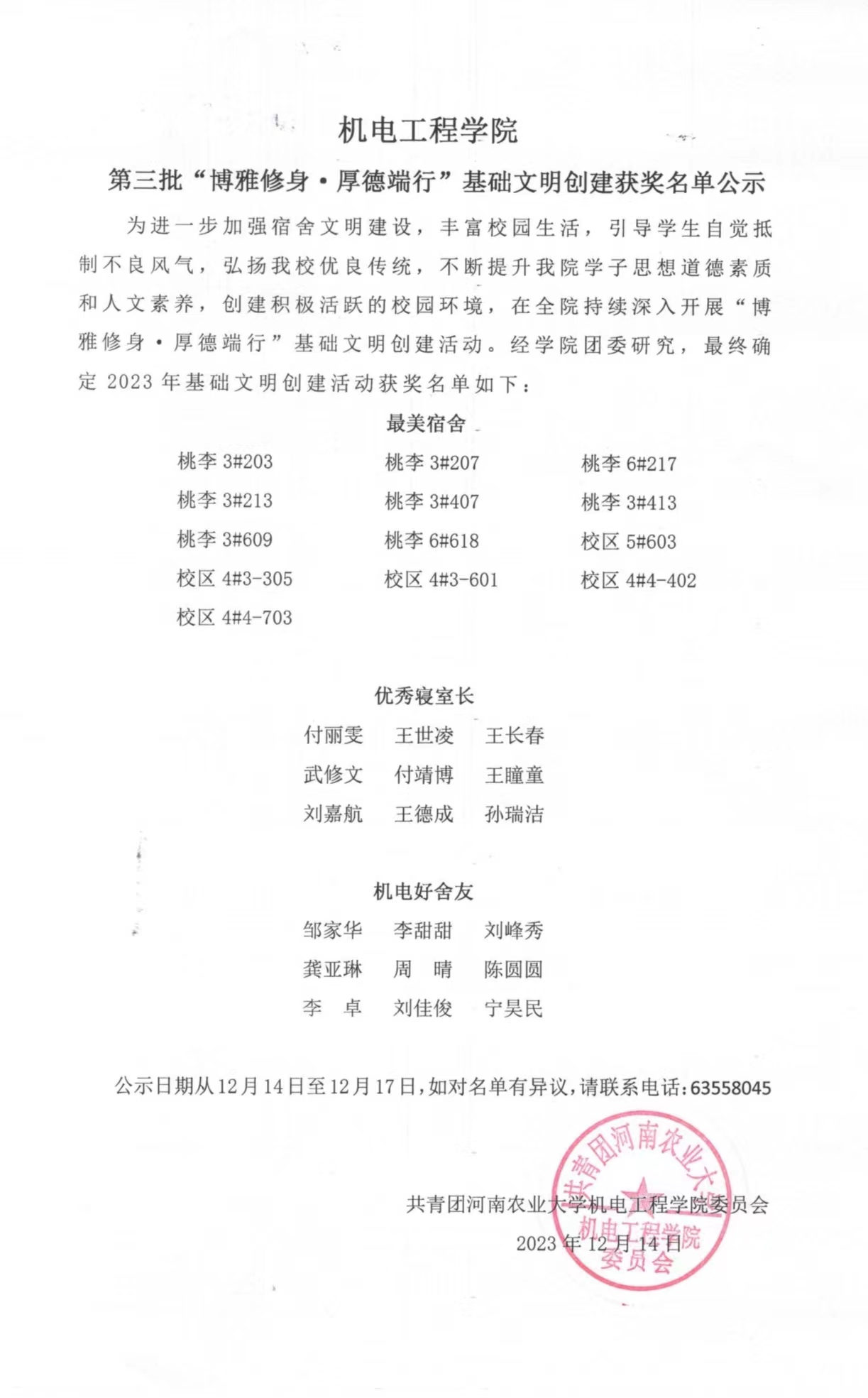 为进一步加强宿舍文明建设,丰富校园生活,引导学生自觉抵制不良风气,弘扬我校优良传统,不断提升色情小说网 学子思想道德素质和人文素养,创建积极活跃的校园环境,在全院持续深入开展“博雅修身·厚德端行”基础文明创建活动。经学院团委研究,最终确定2023年基础文明创建活动获奖名名单如下: