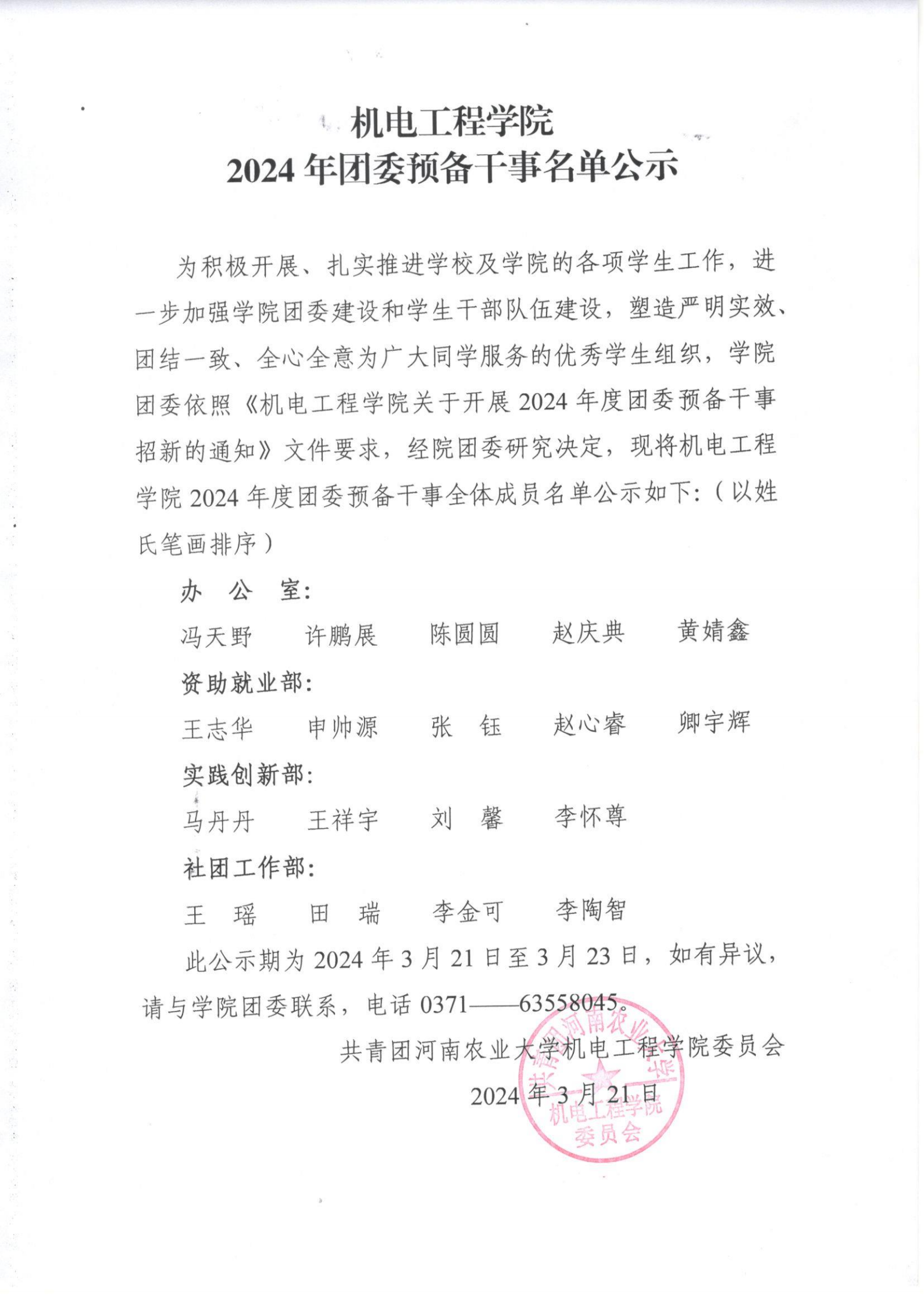 为积极开展、扎实推进学校及学院的各项学生工作,进一步加强学院团委建设和学生干部队伍建设,塑造严明实效、团结一致、全心全意为广大同学服务的优秀学生组织,学院团委依照《色情小说网 关于开展2024年度团委预备干事招新的通知》文件要求,经院团委研究决定,现将色情小说网 2024年度团委预备干事全体成员名单公示如下:(以姓氏笔画排序)