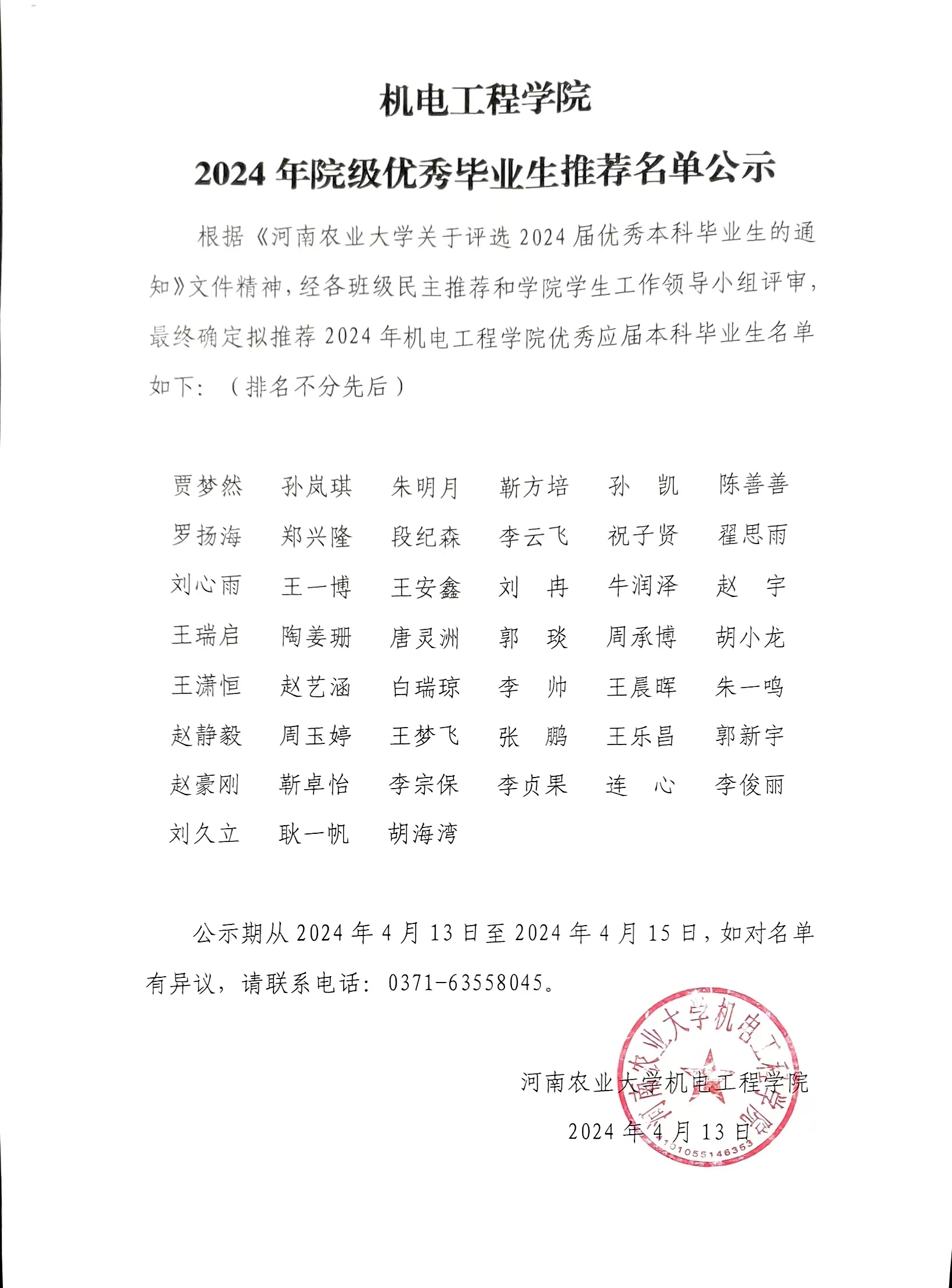 根据《色情小说网 关于评选2024届优秀本科毕业生的通知》文件精神,经各班级民主推荐和学院学生工作领导小组评审,最终确定拟推荐2024年色情小说网 优秀应届本科毕业生名单如下:(排名不分先后)