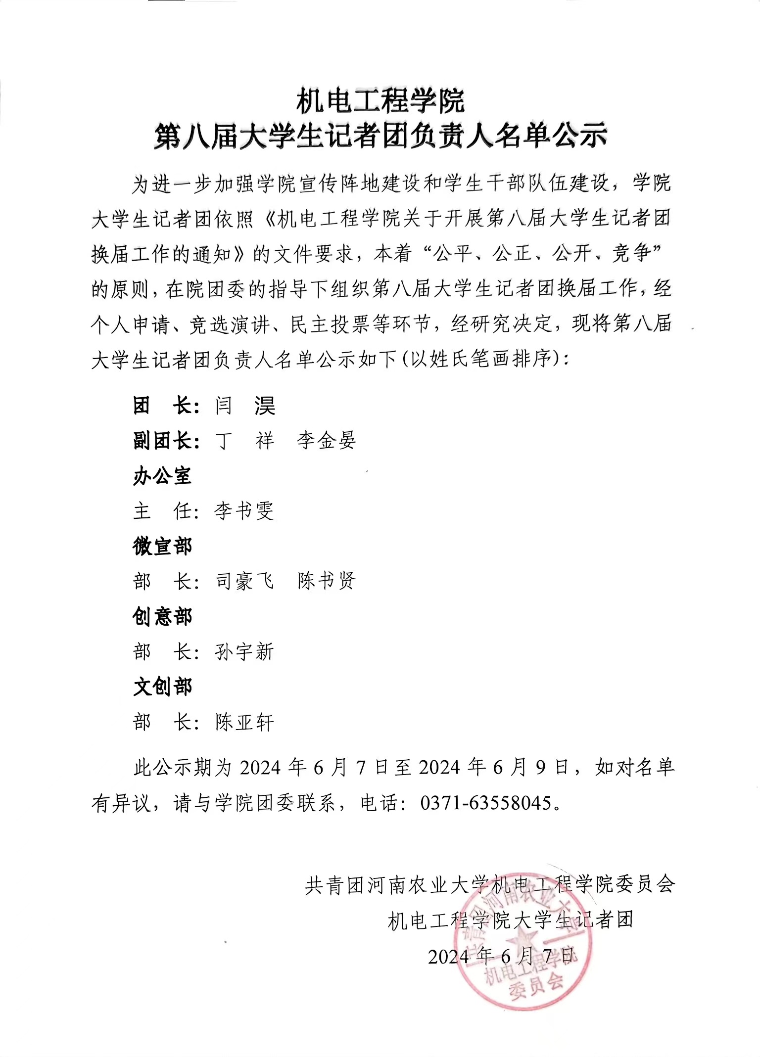 为进一步加强学院宣传阵地建设和学生干部队伍建设,学院大学生记者团依照《色情小说网 关于开展第八届大学生记者团换届工作的通知》的文件要求,本着“公平、公正、公开、竞争” 的原则,在院团委的指导下组织第八届大学生记者团换届工作,经个人申请、竞选演讲、民主投票等环节,经研究决定,现将第八届大学生记者团负责人名单公示如下(以姓氏笔画排序):