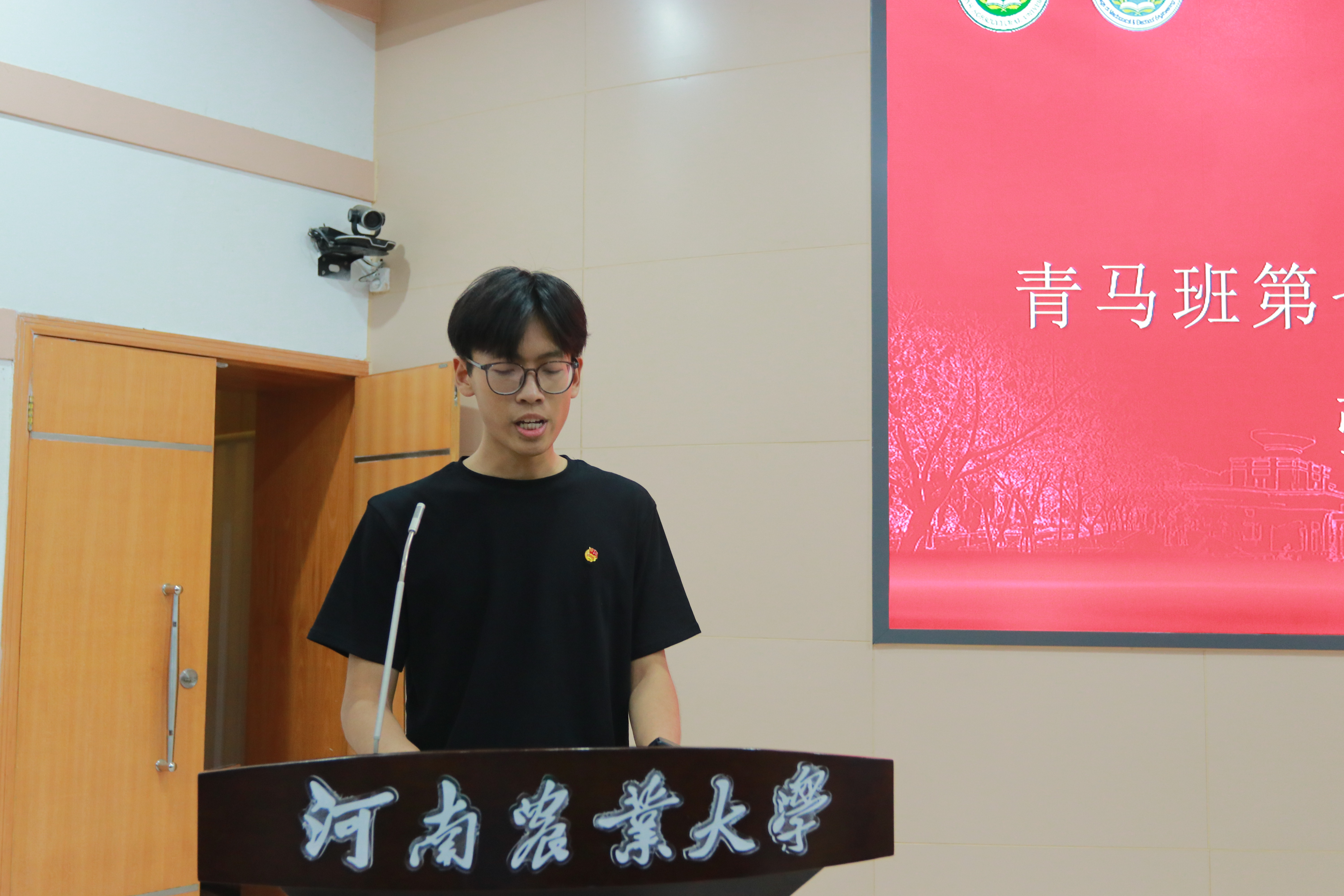 第七期青马班学员代表张轩硕发言。他为大家介绍了“青马工程”的重大意义,并代表新一期青马班成员做出一下承诺:勤奋学习,全面发展;进德修业,力争上游;明辨是非,爱憎分明;笃实肯干,奔向成功。他表明,新一期青马班学员要抓紧契机,调整心态,在今后的青马班学习中丰富完善自己,成为合格的新时代青年。