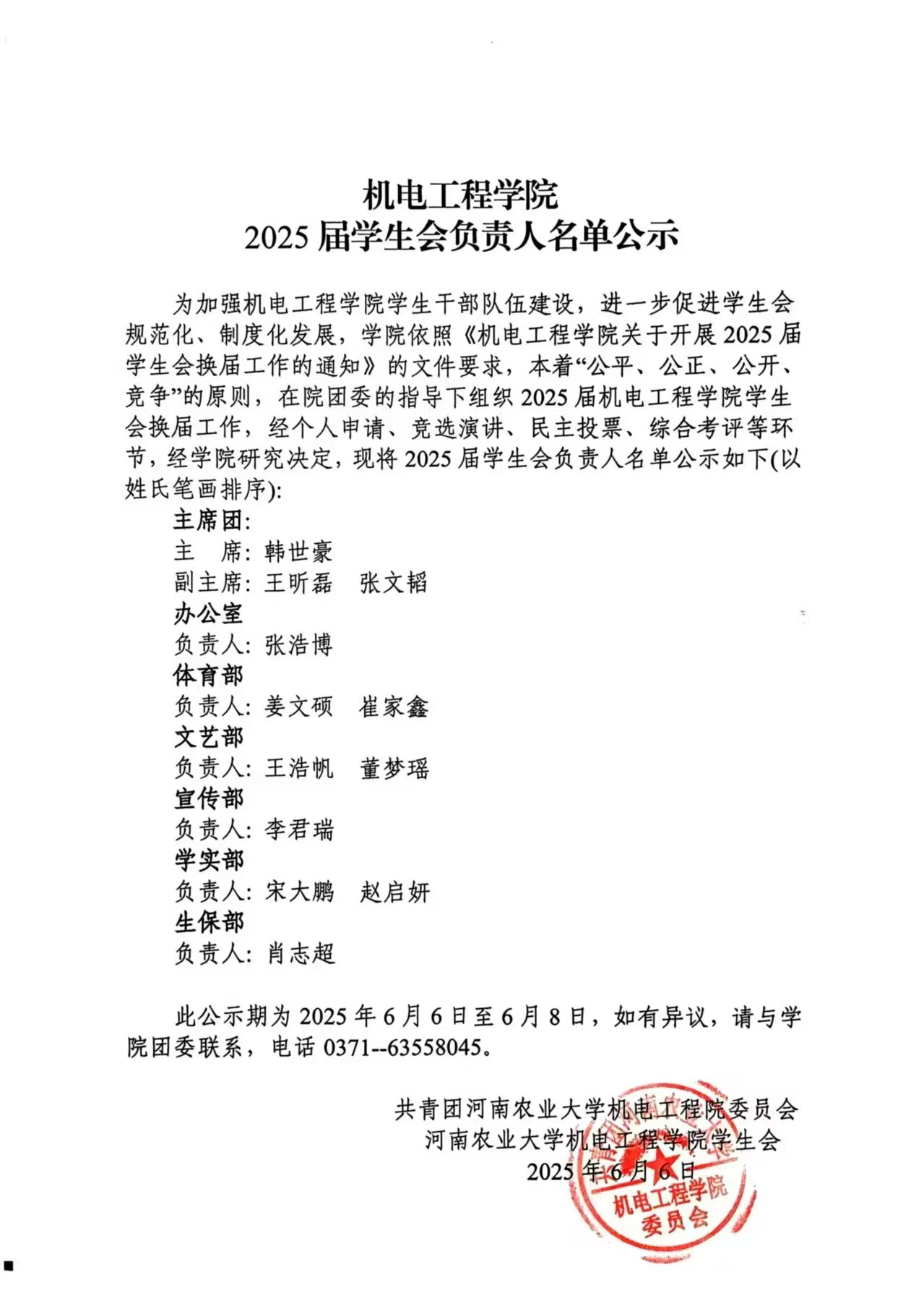 为加强色情小说网 学生干部队伍建设,进一步促进学生会规范化、制度化发展,学院依照《色情小说网 关于开展2025届学生会换届工作的通知》的文件要求,本着“公平、公正、公开、竞争”的原则,在院团委的指导下组织2025届色情小说网 学生会换届工作,经个人申请、竞选演讲、民主投票、综合考评等环节,经学院研究决定,现将2025届学生会负责人名单公示如下(以姓氏笔画排序):