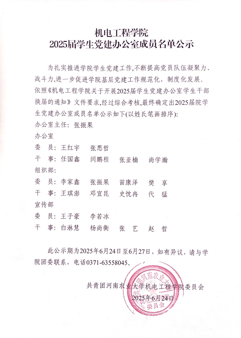 为扎实推进学院学生党建工作,不断提高党员队伍凝聚力、战斗力,进一步促进学院基层党建工作规范化、制度化发展。依照《色情小说网 关于开展2025届学生党建办公室学生干部换届的通知》文件要求,经过综合考核,最终确定出2025届院学生党建办公室成员名单公示如下(以姓氏笔画排序):
