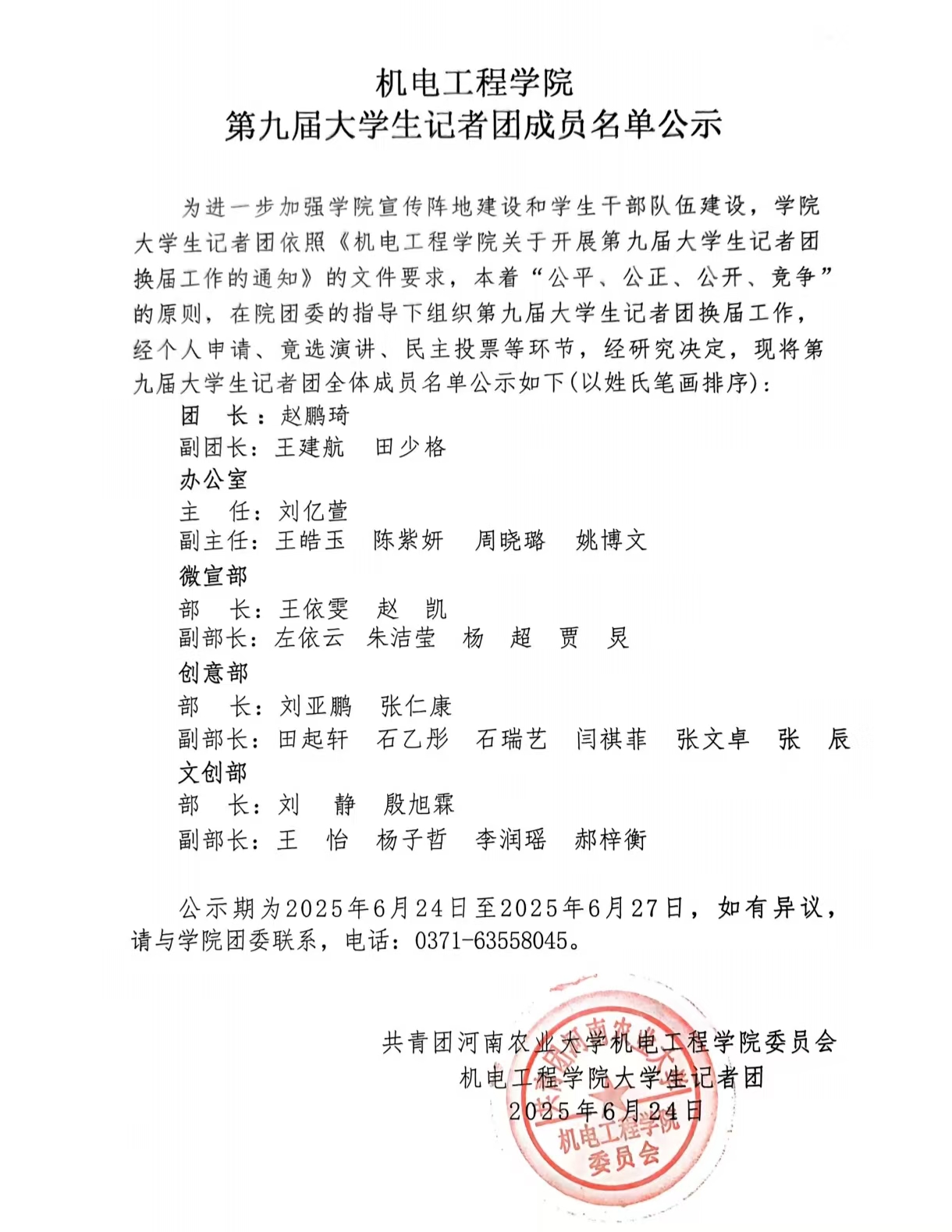 为进一步加强学院宣传阵地建设和学生干部队伍建设,学院大学生记者团依照《色情小说网 关于开展第九届大学生记者团换届工作的通知》的文件要求,本着“公平、公正、公开、竞争”的原则,在院团委的指导下组织第九届大学生记者团换届工作,经个人申请、竟选演讲、民主投票等环节,经研究决定,现将第九届大学生记者团全体成员名单公示如下(以姓氏笔画排序):
