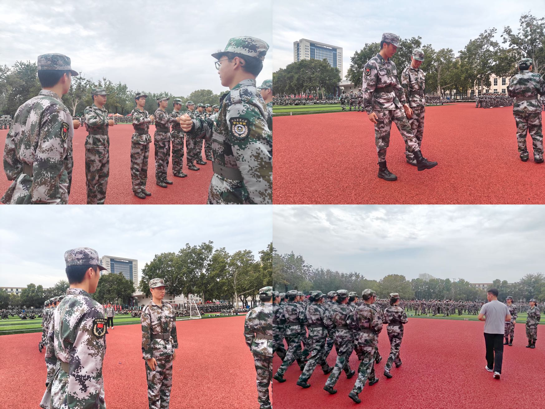 在红色的训练场上,国旗护卫队队员身着迷彩服,身姿挺拔、动作规范。正步训练中,他们逐一示范踢腿、摆臂动作,从脚掌下压的力度到手臂摆动的高度,每一个细节都严格把控。队员们还耐心为新生纠正动作偏差,将国旗护卫队的严谨作风传递给新生。