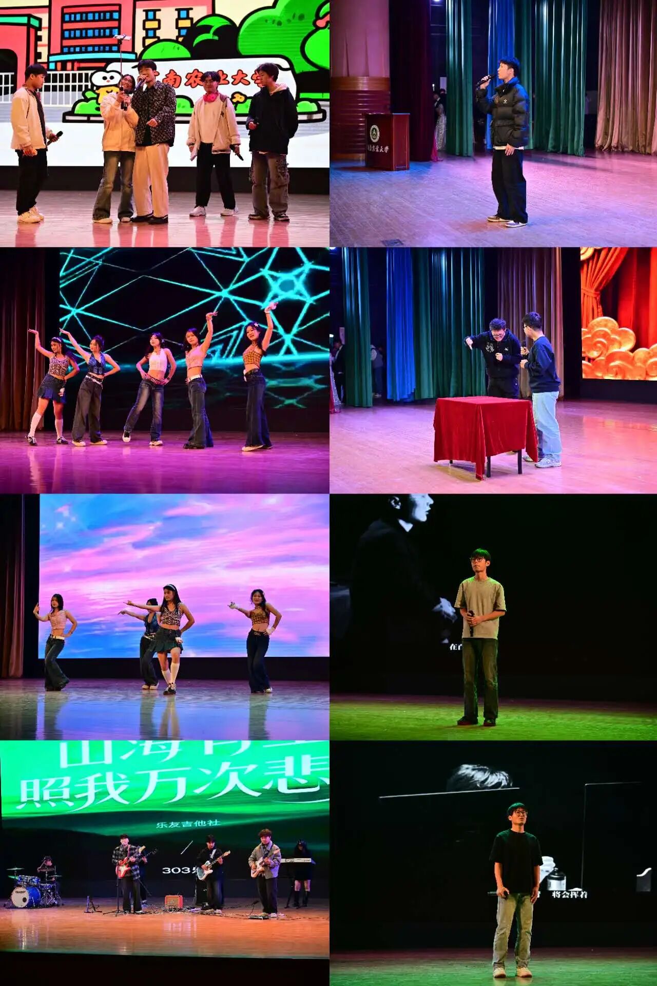 晚会以活力四射的舞蹈开场,舞者们明快的节奏、灵动的身姿瞬间点燃现场气氛。随后,温柔抒情的歌曲依次唱响,细腻的歌声唱出青春心事,引得台下新生轻声跟唱。幽默的相声与小品结合农大校园生活场景,用接地气的剧情和台词逗得全场笑声不断。最后,晚会特别增设“生日新生合唱”环节和助班表演,用精彩演出为晚会画上圆满句号。
