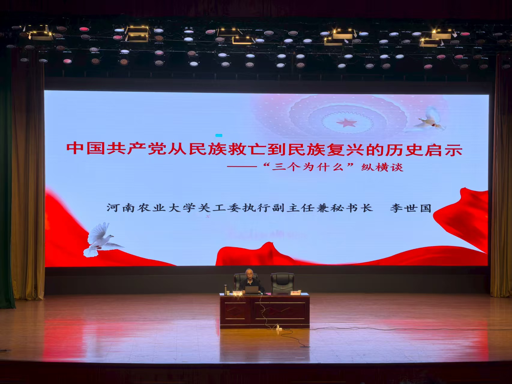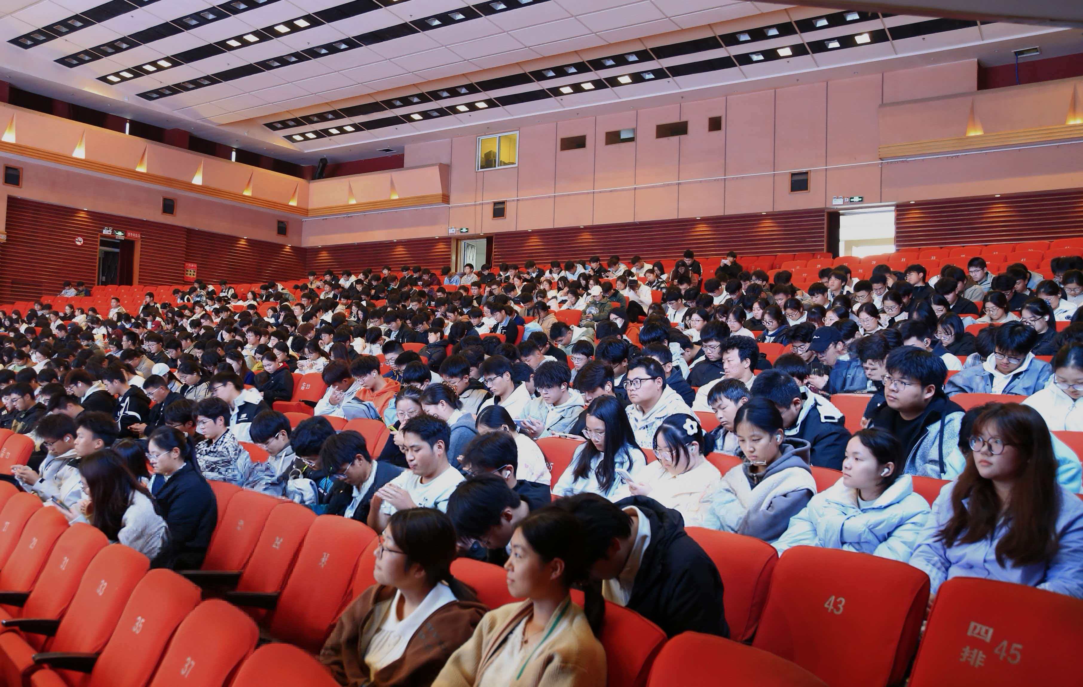 于文化路校区千人大礼堂召开“大学生成长成才报告会”。此次报告会由研究生辅导员李锦老师主持,校关工委执行副主任兼秘书长李世国老师主讲,以党史为脉络,为25级全体新生带来了一场思想深刻、内容丰富的“开学第一课”。