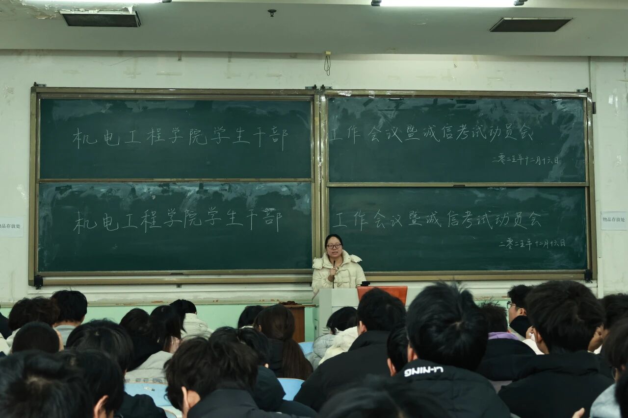 在工程楼101召开学生干部工作会议暨诚信考试动员大会,李锦老师、团委副书记王晓楠和年级辅导员孙改革、梁凯凯出席会议,全体班长支书和学生组织成员参加本次会议。