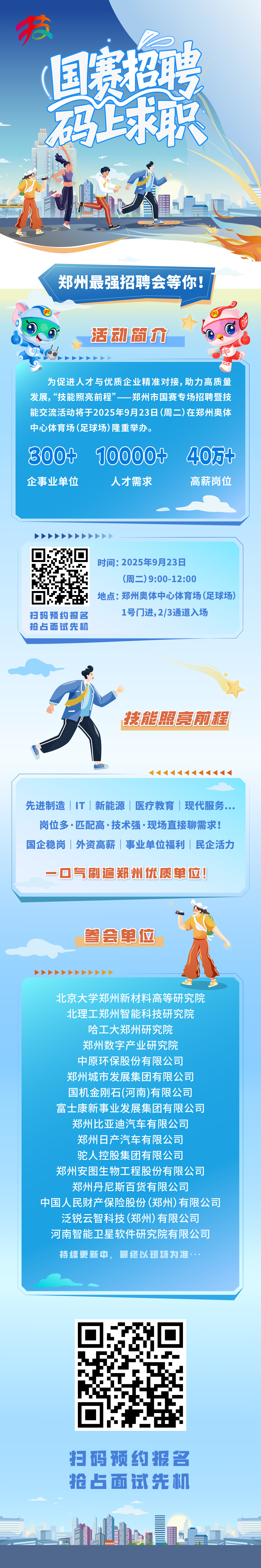 为促进高校毕业生与用人单位精准对接,助力毕业生充分就业。省人社厅、郑州市委、市政府将于2025年9月23日(周二)上午9:00至12:00在郑州奥体中心体育场(足球场,中原区西四环与博体路交叉口)举办“技能照亮前程”——郑州市国赛专场招聘暨技能交流活动。届时邀请300余家先进制造业、新能源、医疗、教育、现代服务业等行业用人单位参与现场招聘,提供10000余个就业岗位。具体岗位信息见附表。