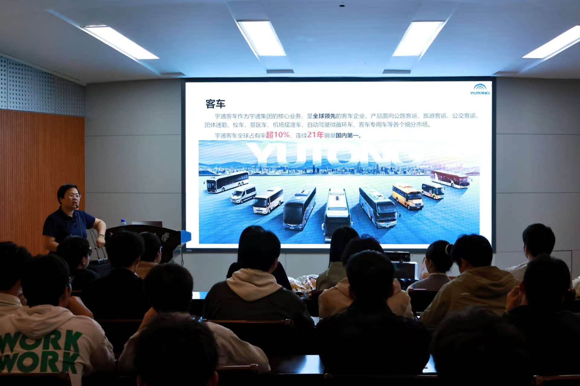 招聘负责人鄂媛围绕企业发展与招聘需求展开详细分享,她系统介绍了宇通集团在客车、重工两大核心板块的产业布局与发展历程,以行业数据与案例展现企业的行业领先地位及全球视野,同时重点解读集团2025届招聘计划,明确对销售、技术、售后服务工程师等岗位的需求,强调对高校毕业生的重视与培养决心;她还详解为毕业生量身打造的培养体系,提及创新奖励机制,说明岗位选择可匹配个人需求,其中重工板块“专业创造价值”的理念引发关注,并明确“线上投简历、线下面试”的流程安排,为学子提供指引。